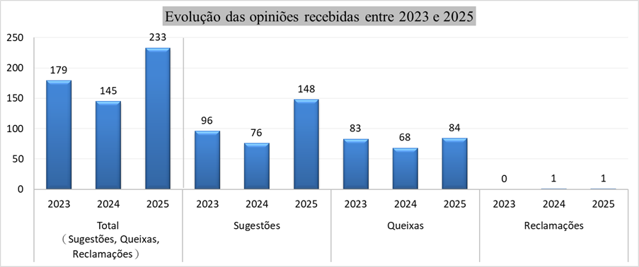 Dos 84 casos de queixas, além de oito serem anónimos, um autor revelou não ser necessária resposta, e os demais 75 casos foram objecto de contacto. - Quanto às sugestões, embora o diploma legal aplicável não o regule expressamente, em nome da optimização dos serviços prestados e de bem servir os cidadãos, esta Direcção de Serviços reagiu igualmente aos respectivos autores. Das 148 sugestões recebidas em 2025, para além de 16 serem anónimas, cinco autores revelaram não ser necessário contacto; os demais 127 casos foram todos contactados.